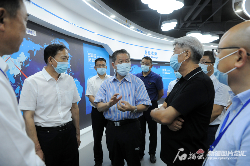 7月14日,中国工程院院士、安徽理工大学校长袁亮(穿蓝色衬衣)在参观克拉玛依云计算产业园时,对该园的发展提出建议意见。 石榴云/新疆日报记者 秦梅花摄