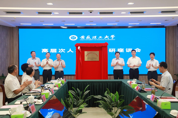任泽锋、郭永存为“淮南市高校人才工作站”揭牌,袁亮、宫能平、马文革、胡东辉见证。