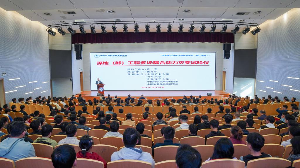 10月26日,校党委副书记、校长袁亮院士主持的国家自然科学基金重大科研仪器研制项目(部门推荐)——“深地工程多场耦合动力灾变试验仪”项目推进会在安徽淮南顺利召开。中国矿业大学(北京)武强院士、中国石油大学(北京)张来斌院士、煤炭开采国家工程技术研究院王传兵教授级高工作为特邀专家出席会议,中国矿业大学安全工程学院党委书记王恩元教授、中国矿业大学窦林名教授、山东大学岩土工程中心王汉鹏教授、中国科学院声学研究所副主任何晓研究员、中国地震局地质研究所主任陈建业研究员等项目研究骨干出席本次会议,我校各学院教师及研究生约400余人聆听了相关报告。
